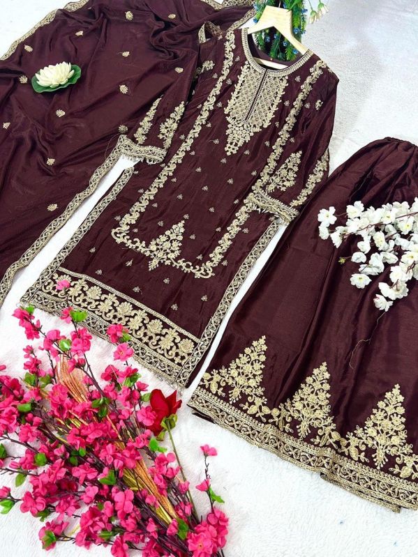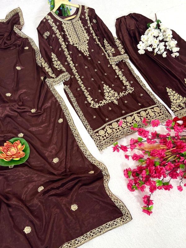 *New Brown Coloured Embroidered Attractive Party Wear Chinon Silk fabric Kurti pair has a Regular-fit to customer*